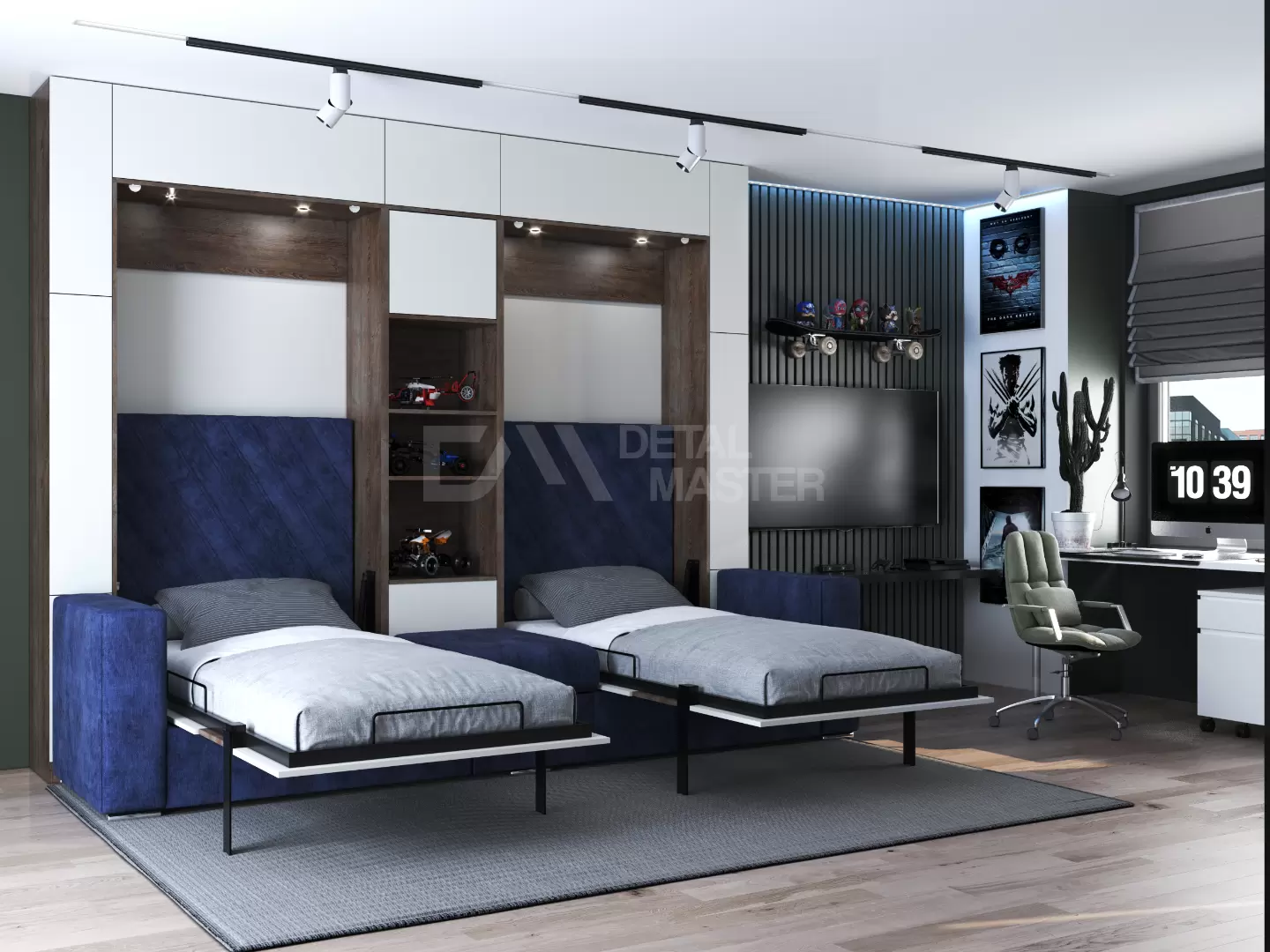 Детская шкаф-кровать с двумя спальными местами  "Twin" работает на механизме раскладывания собственной разработки "Balance". Кровать раскладывается легким движением руки, превращаясь в полноценное спальное место. Просто потяните за ножку-маятник, которая самостоятельно фиксируется в нужное положение при опускании.
